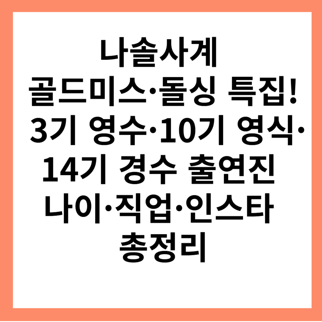 ✅ ‘나는 SOLO 사계(나솔사계)’ 골드미스·돌싱 특집이 방송되면서 출연진들의 나이, 직업, 인스타그램 등에 대한 관심이 뜨겁습니다. 이번 특집에는 3기 영수, 10기 영식, 14기 경수가 등장하여 새로운 사랑을 찾아가는 모습을 보여주고 있는데요.