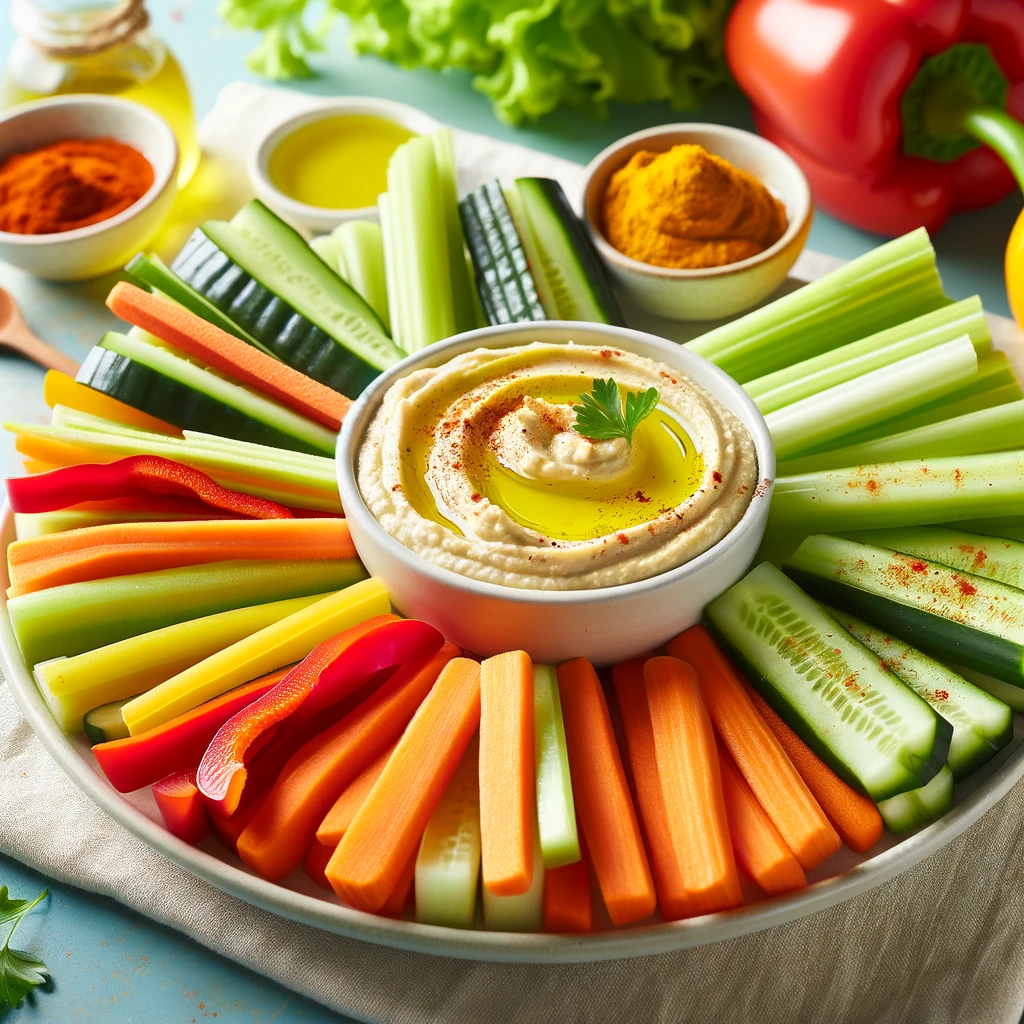 - 후무스를 소스처럼 사용하여 야채 스틱을 찍어 먹습니다.